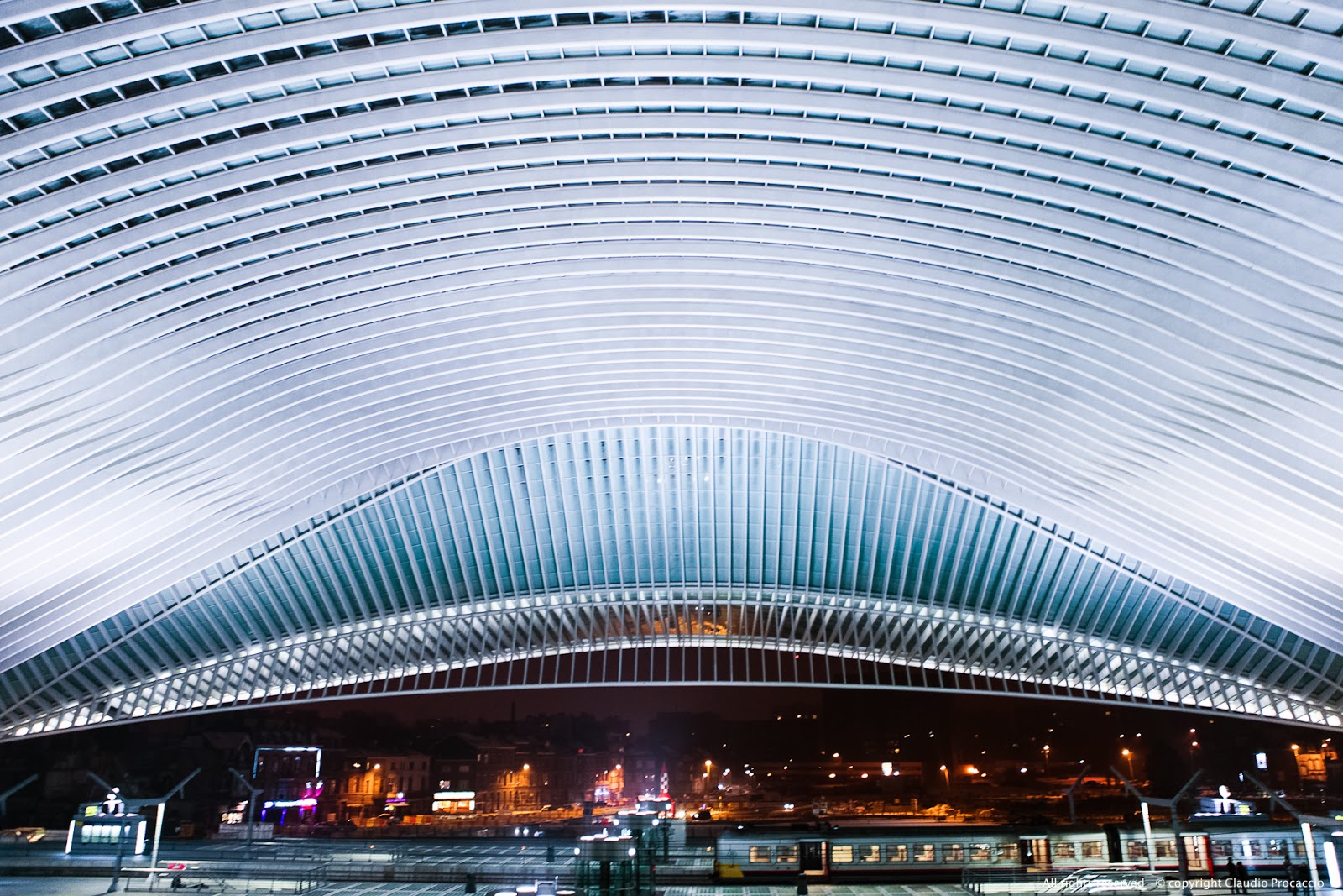 D’inverno è una collina innevata, d’estate superficie argentea specchio del cielo, di sera corpo estraneo venuto dallo spazio. Uno scenario lunare, con una luce metafisica. Uno spazio indimenticabile per l’imponente struttura creata da archi di calcestruzzo armato con un’altezza di 36 metri e una luce di 160. Il viaggiatore giunto nella città di Liegi è accolto da una calotta celeste di vetro e cemento, immensa e luminosa, e viene fagocitato all’interno della struttura stessa attraverso una vera a propria discesa nel corpo di una balena. Una discesa sotto il mare. Il tutto rivestito di pietra blu. La pietra belga che non è propriamente dai toni del celeste ma di un grigio unico.